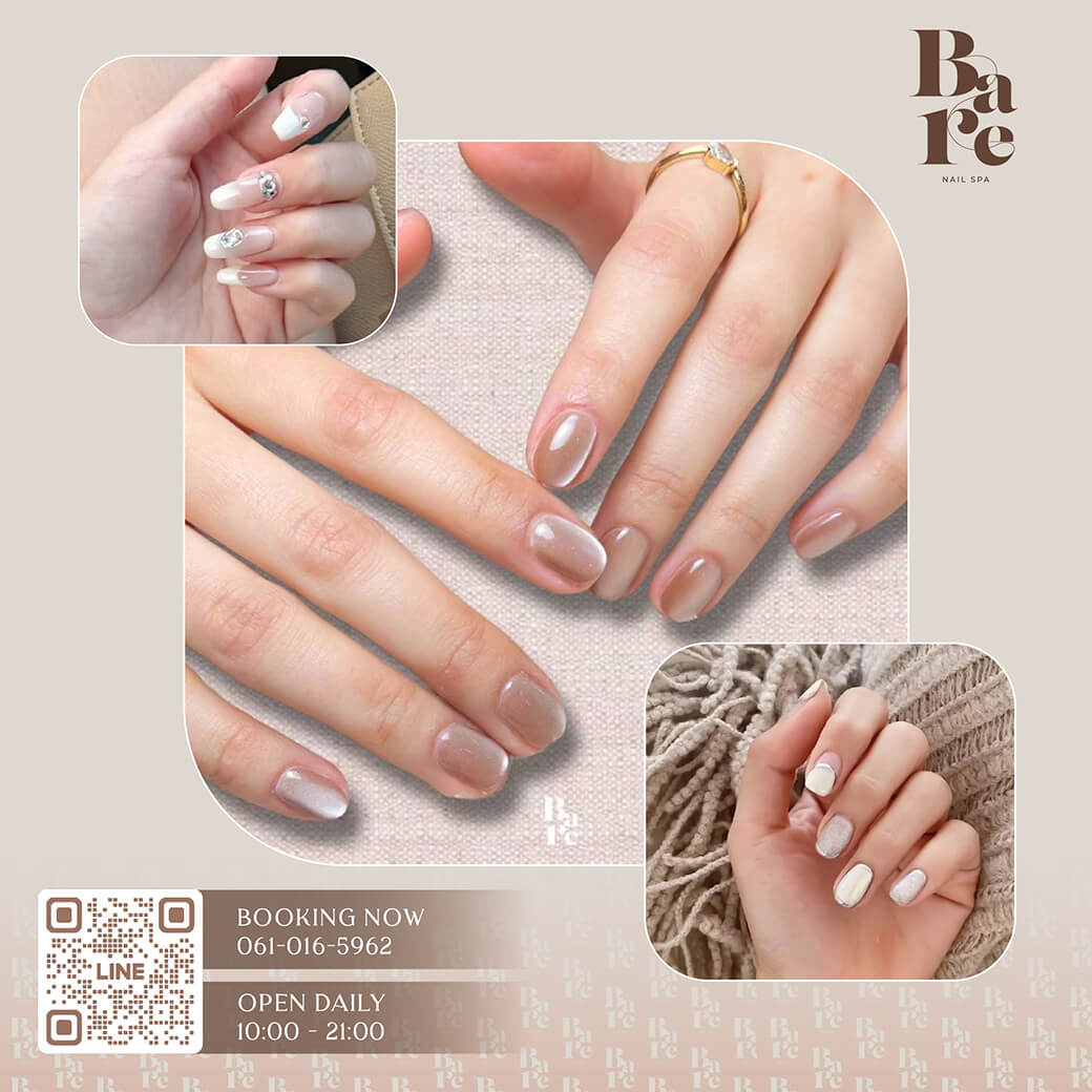 ขอต้อนรับทุกท่านสู่ Bare Nail Spa ร้านทำเล็บสไตล์มินิมอล บรรยากาศอบอุ่น ผ่อนคลาย พร้อมการบริการที่ใส่ใจในทุกขั้นตอน