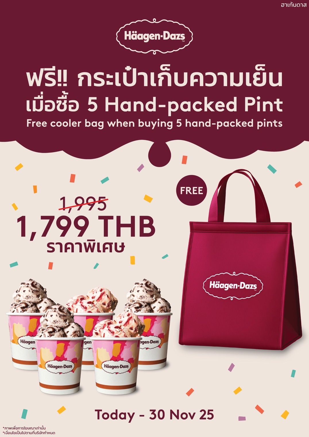 ซื้อ 5 Hand-packed Pint ในราคา 1,799 บาท รับฟรี!!!กระเป๋าเก็บความเย็น Haagen-Dazs สุดคิ้วท์ ที่ร้านฮาเกนดาส สาขาพรอมานาด เท่านั้น!!!